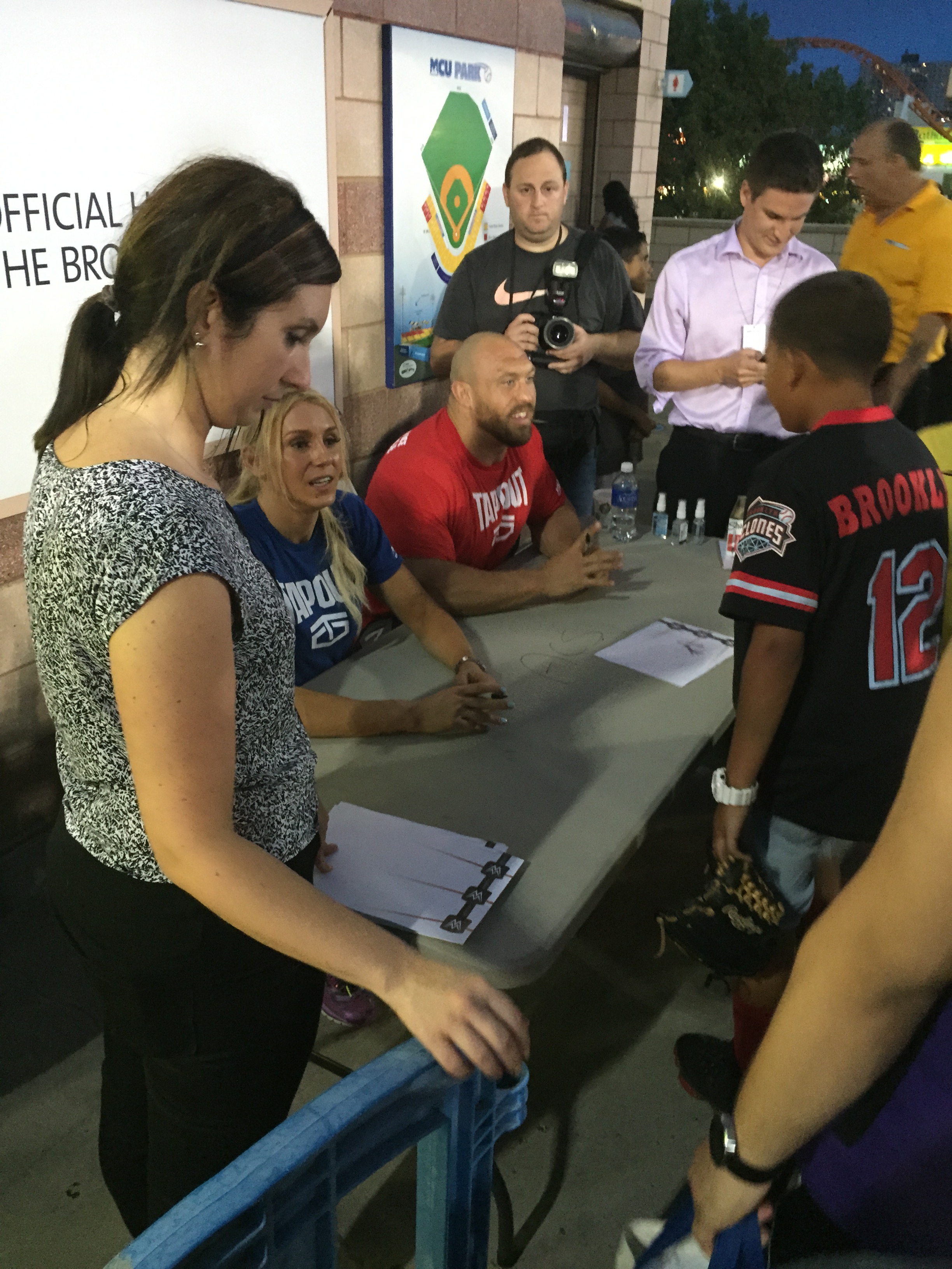 Before the signing, it was announced that the foursome would be split into two separate signings: Ryback & Charlotte would be signing along the Left Field side while Eva Marie & Fandango would be signing along the Right Field side. Essentially, you were forced to pick which two you wanted because it was HIGHLY unlikely you’d somehow manage to get through both lines.
